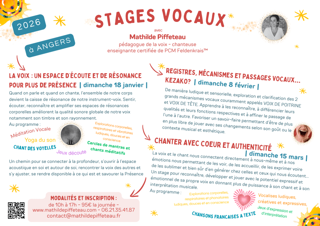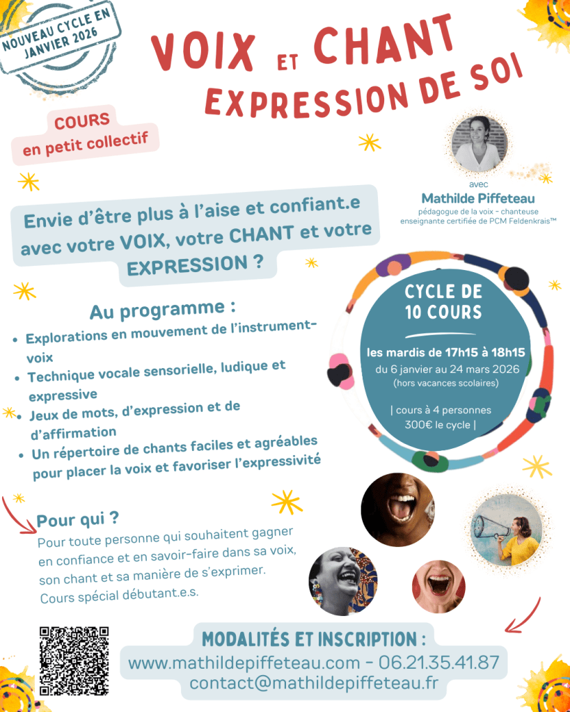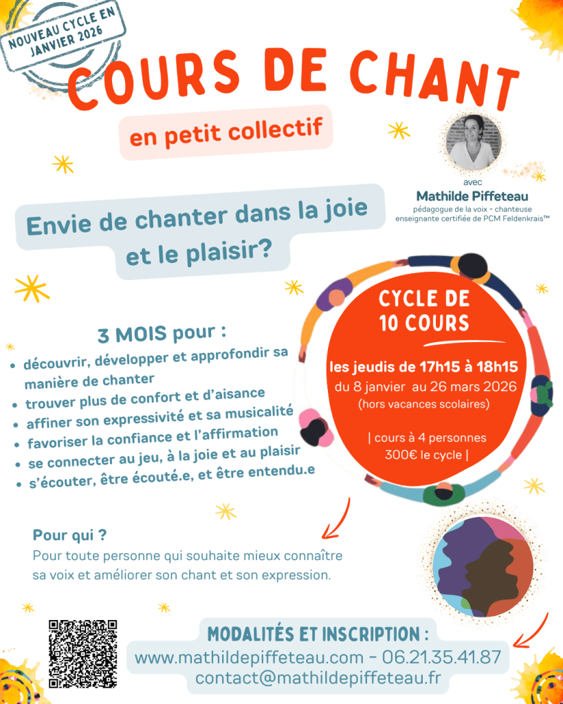 Vous trouverez au fil des pages des propositions d’exploration, d’apprentissage et d’expression autour de la VOIX, du CHANT, de la MÉDITATION et du MOUVEMENT.