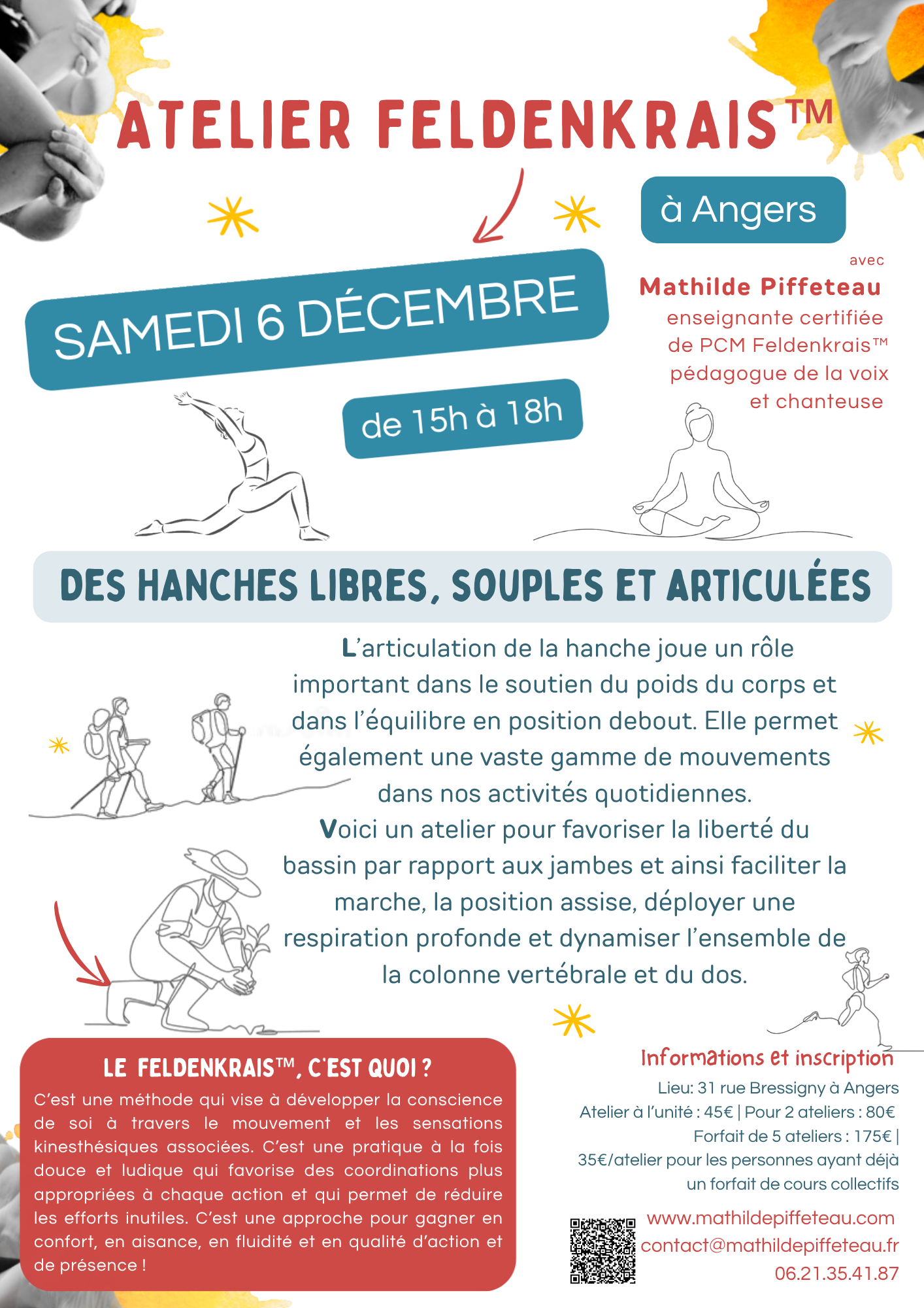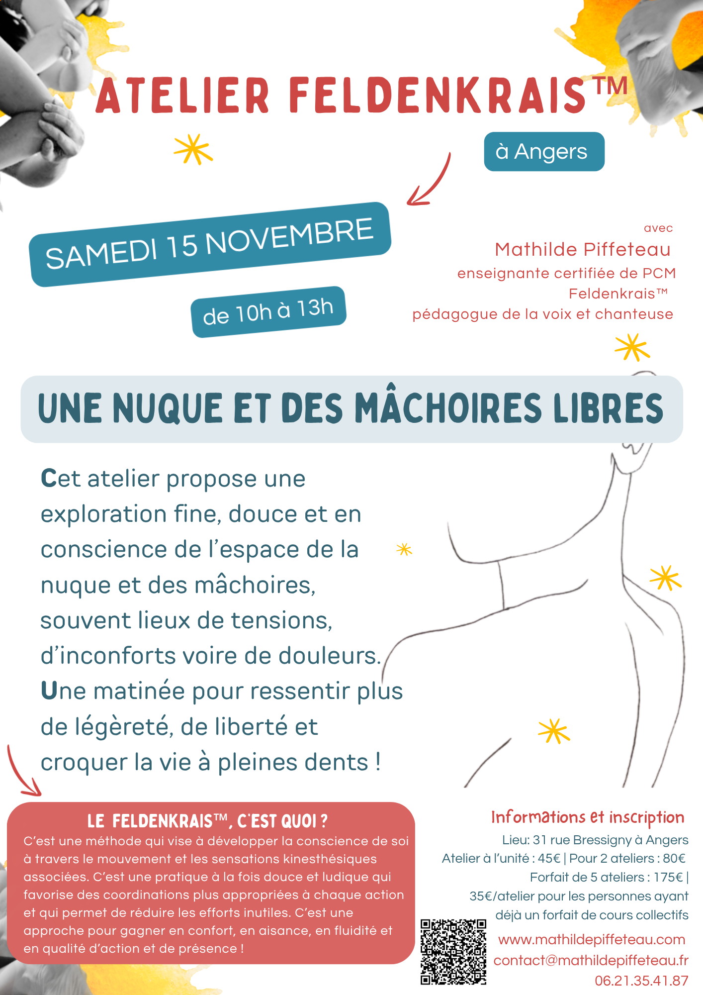 13 septembre – Un DOS long, solide, souple et vivant11 octobre – Le BASSIN: un centre présent, mobile et dynamique15 novembre – exceptionnellement de 10h à 13h – Une NUQUE et des MÂCHOIRES libres6 décembre – Des HANCHES libres, souples et articulées- 17 janvier – RALENTIR… pour mieux sentir, (s’)écouter et (s’)ajuster
