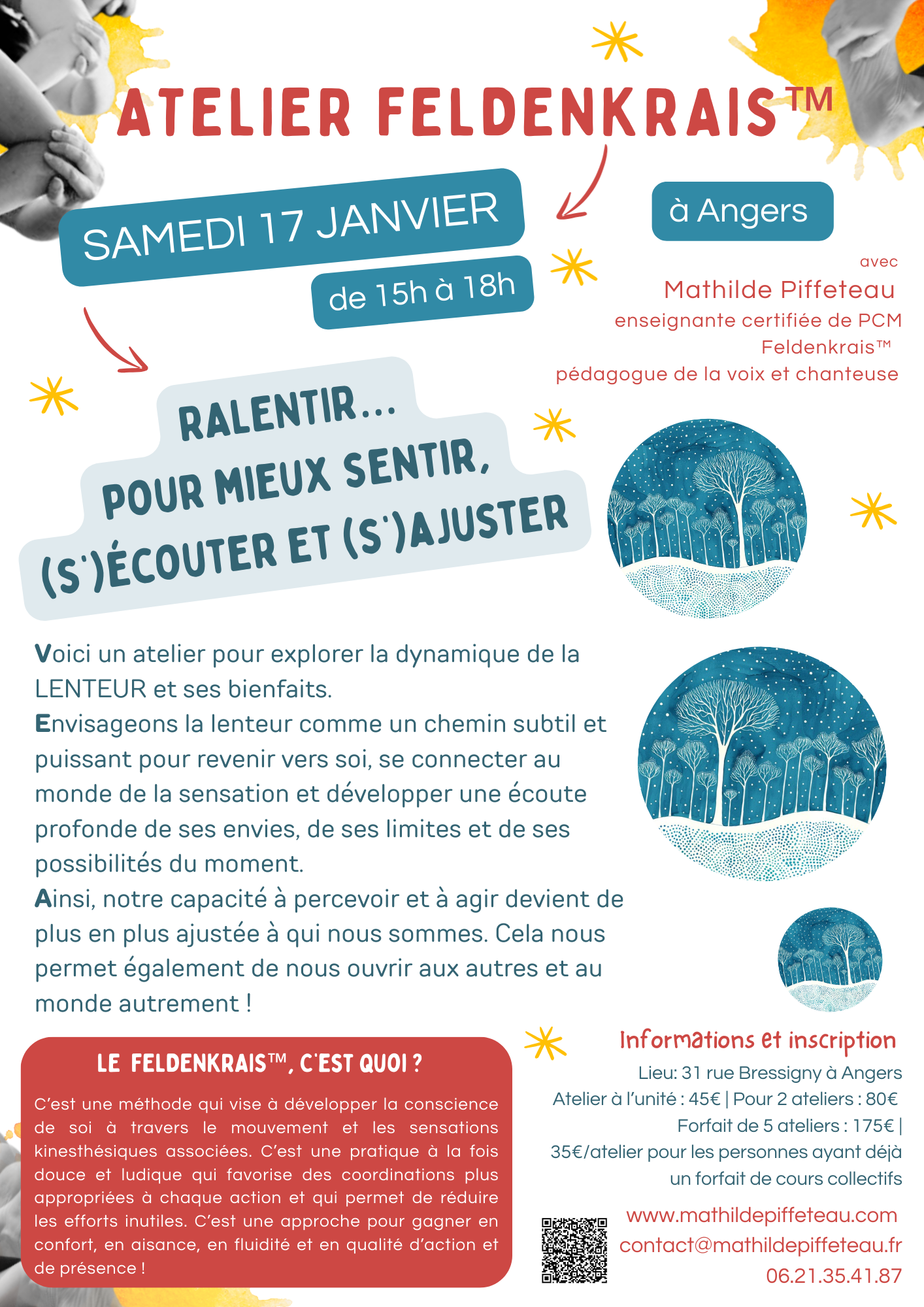 Les ateliers mensuels sont pour certain.e.s un espace de découverte de la méthode, ou une manière de pratiquer régulièrement et pour d’autres un approfondissement des cours hebdomadaires en bénéficiant alors d’un temps plus long pour aller plus tranquillement et finement dans la pratique.