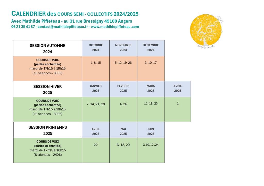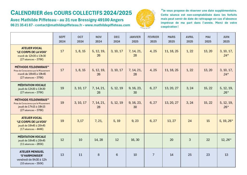 CALENDRIER COURS COLLECTIFS 2024/2025 Calendrier COURS COLLECTIFS REGULIERS 2024-2025 – MATHILDE PIFFETEAU – A PORTEE DE VOIX Calendrier COURS SEMI-COLLECTIF 2024-2025 – MATHILDE PIFFETEAU