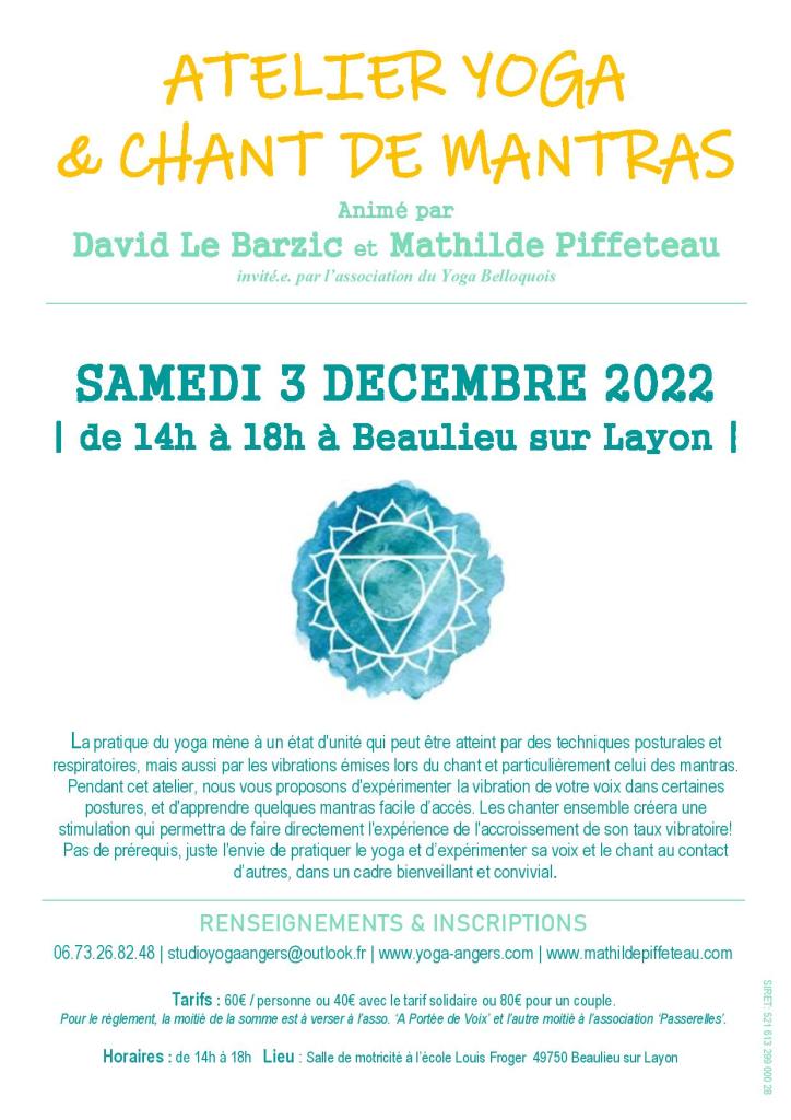 En 2006, la rencontre avec le yoga au travers de l’enseignement de David Le Barzic, m’a permis d’expérimenter une détente et une tonicité corporelles nécessaires dans le chant comme dans la vie ! Depuis 2010, nous organisons régulièrement et conjointement des ateliers et des stages « Yoga & Chant » qui mettent en valeur la richesse du dialogue entre les deux disciplines. Pour le yogi, l’expérience du chant prolonge la sensation de rééquilibrage créée par la séance de yoga, tout en permettant un partage avec les autres, une extériorisation, une mise en application directe de ce recentrage. Quant à la pratique du chant, elle ne fait que s’enrichir lorsqu’elle s’appuie sur les méthodes de réappropriation de nos espaces corporels, respiratoires et mentaux que permet le yoga.